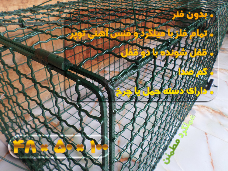 + بدون فنر کششی برای کشیدن در (فنر در تله های زنده گیر پس از مدتی فعال ماندن براحتی هرز می شود و درب تله بخوبی بسته نمی شود)